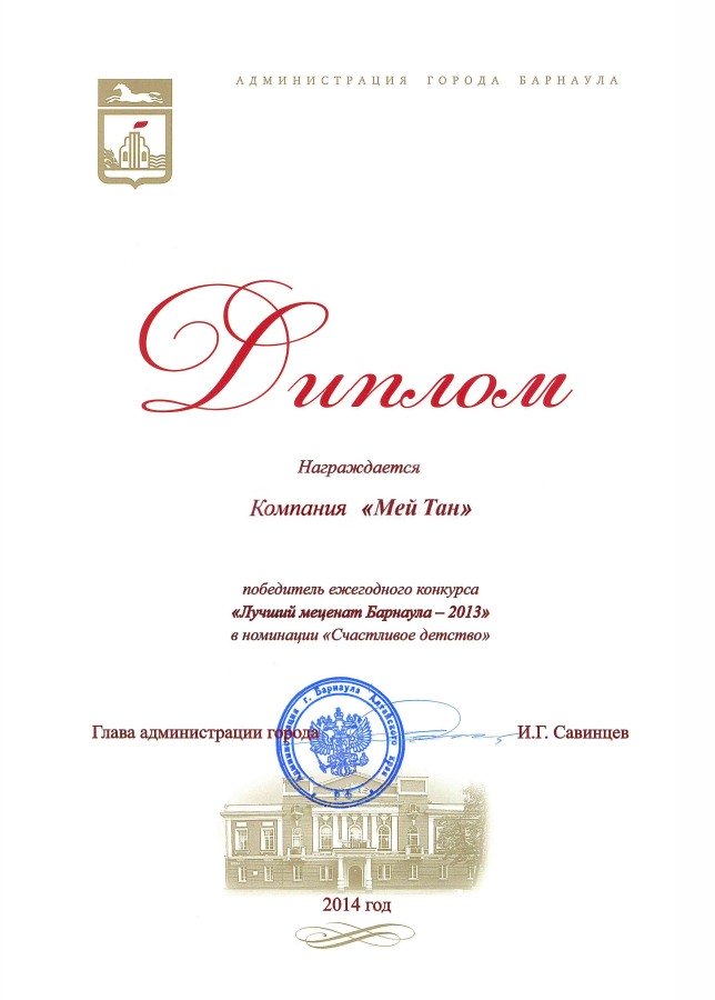 - Компания МейТан награждена почетной грамотой Администрации Алтайского края «За оказание благотворительной помощи Алтайской краевой клинической детской больнице».
