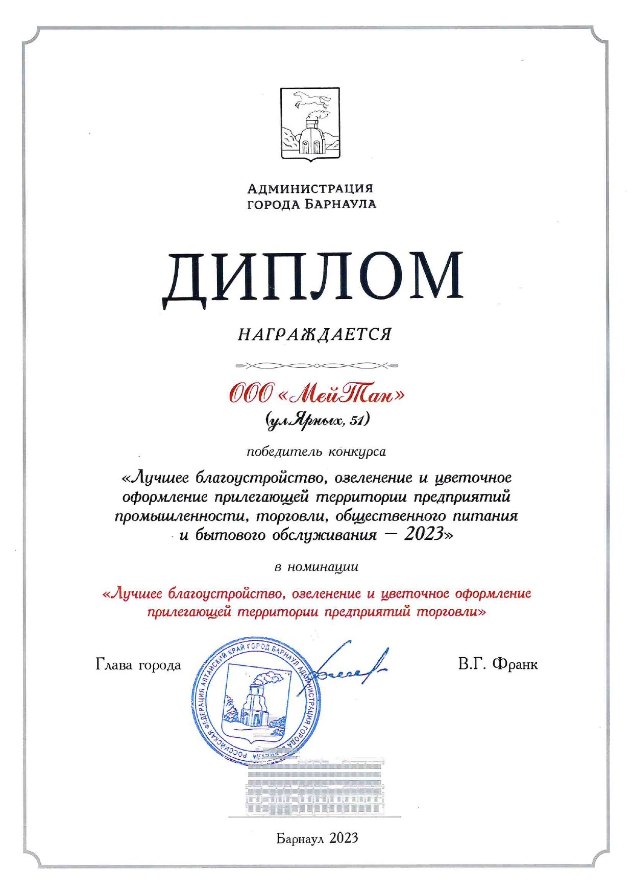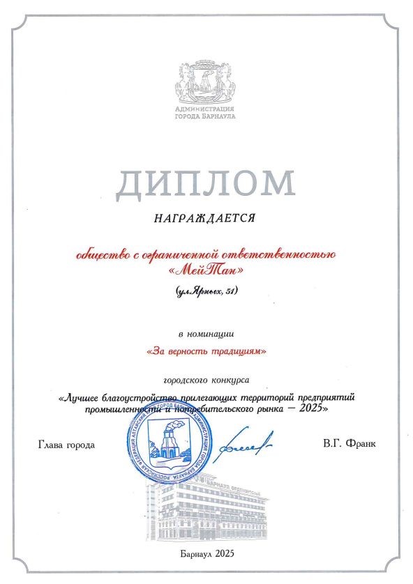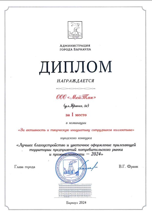 Диплом победителя конкурса «Лучшее благоустройство, озеленение и цветочное оформление прилегающей территории предприятий торговли» за благоустройство территории вокруг генерально офиса МейТан.