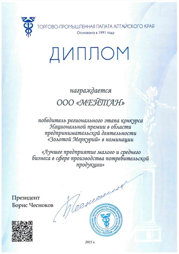 Диплом победителя регионального этапа конкурса Национальной премии в области предпринимательской деятельности «Золотой Меркурий-2025» в номинации «Лучшее предприятие малого и среднего бизнеса в сфере производства потребительской продукции»