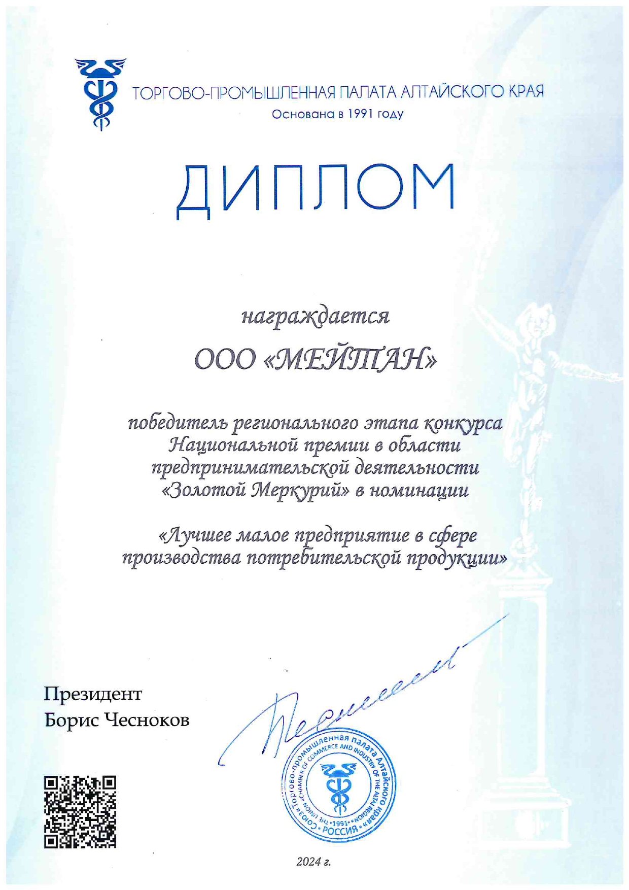Диплом победителя регионального этапа конкурса Национальной премии в области предпринимательской деятельности «Золотой Меркурий» в номинации «Лучшее малое предприятие в сфере производства потребительской продукции».