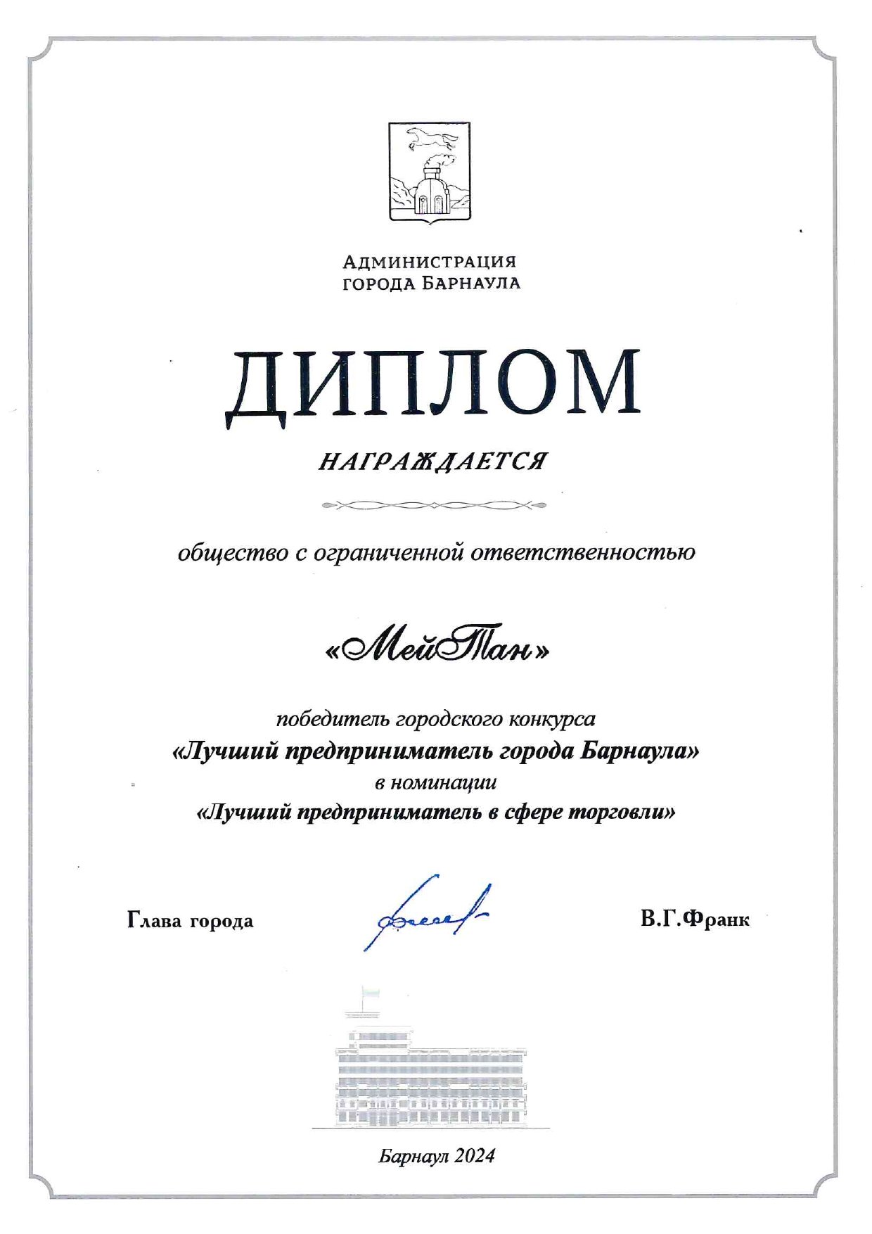 Диплом администрации Барнаула «Лучший меценат года» в номинации «Счастливое детство».