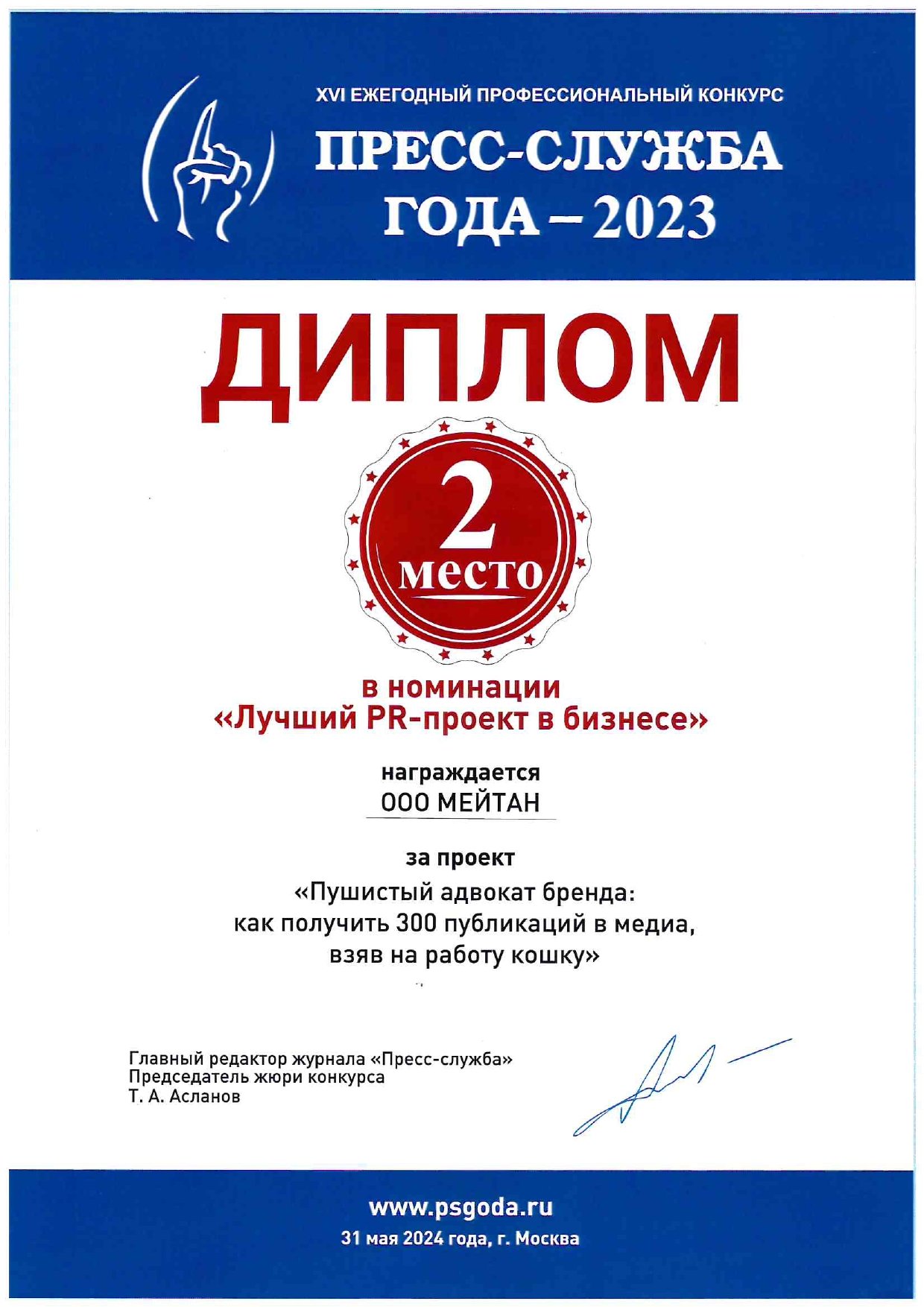 Диплом международного конкурса «Пресс-служба Года» за II место в номинации «Лучший PR - проект в бизнесе».