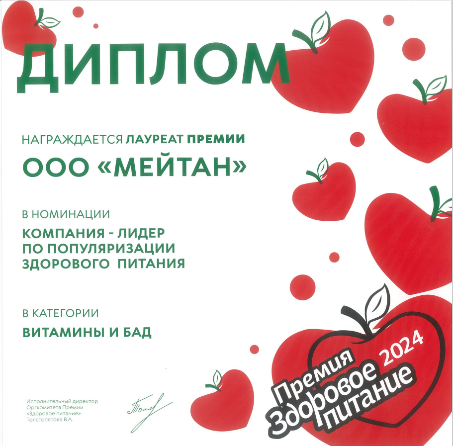 Диплом лауреата премии «Здоровое Питание» в номинации «Компания — Лидер по популяризации здорового питания» в категории «Витамины и БАД».