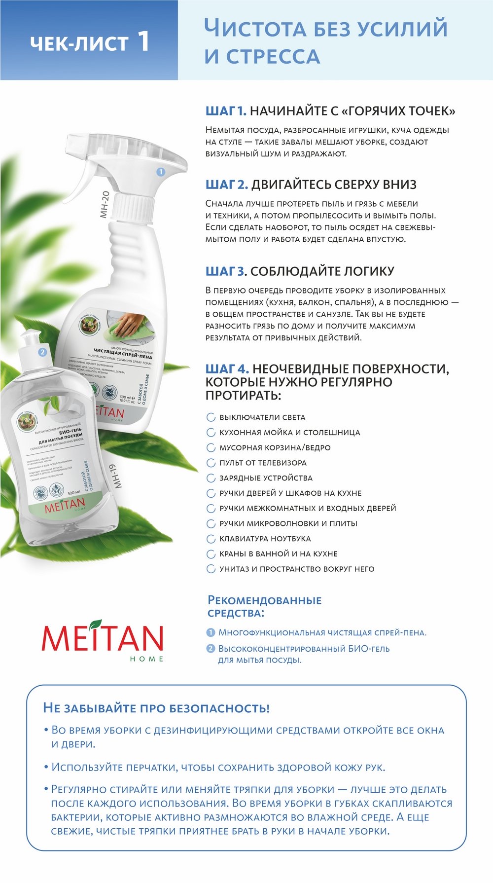 Чтобы вымыть пол и любые поверхности (паркет, плитка, камень, стекло, пластик, дерево, обои), используйте также многофункциональную чистящую спрей-пену, также можно использовать БИО-гель для мытья посуды. Уборка с этими средствами пройдет эффективно и быстро. Благодаря активной формуле БИО-гель отлично удаляет бактерии с различных поверхностей.