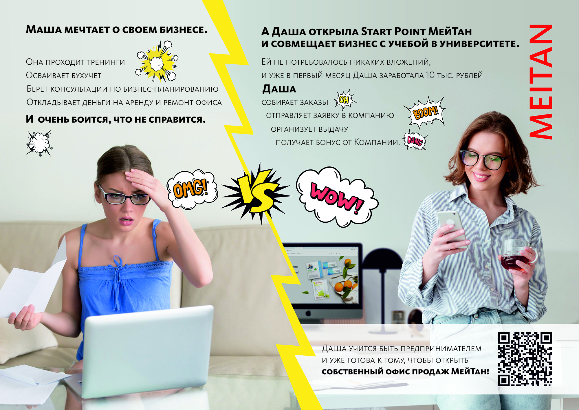 Бизнес с МейТан — это поддержка на каждом этапе работы, успешный Маркетинг-план, качественная продукция и неограниченные возможности. В Компании можно найти много полезной информации для начинающих свою карьеру в сфере прямых продаж. Станьте Партнером МейТан и получите скидку 20% на всю продукцию после регистрации.