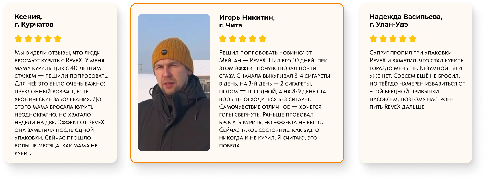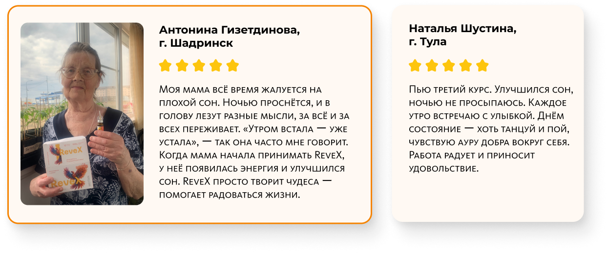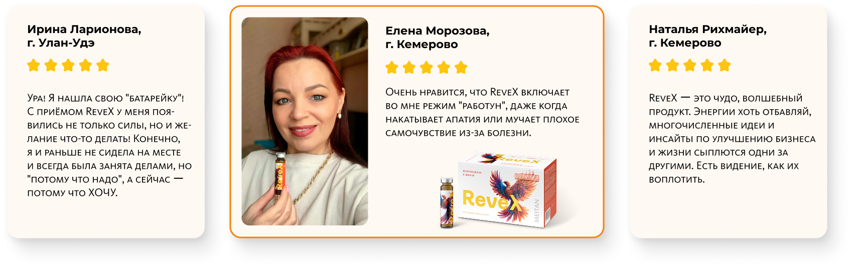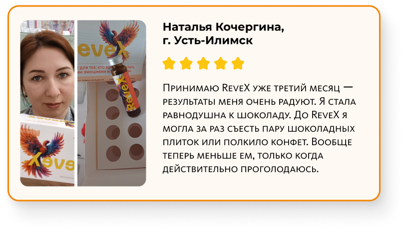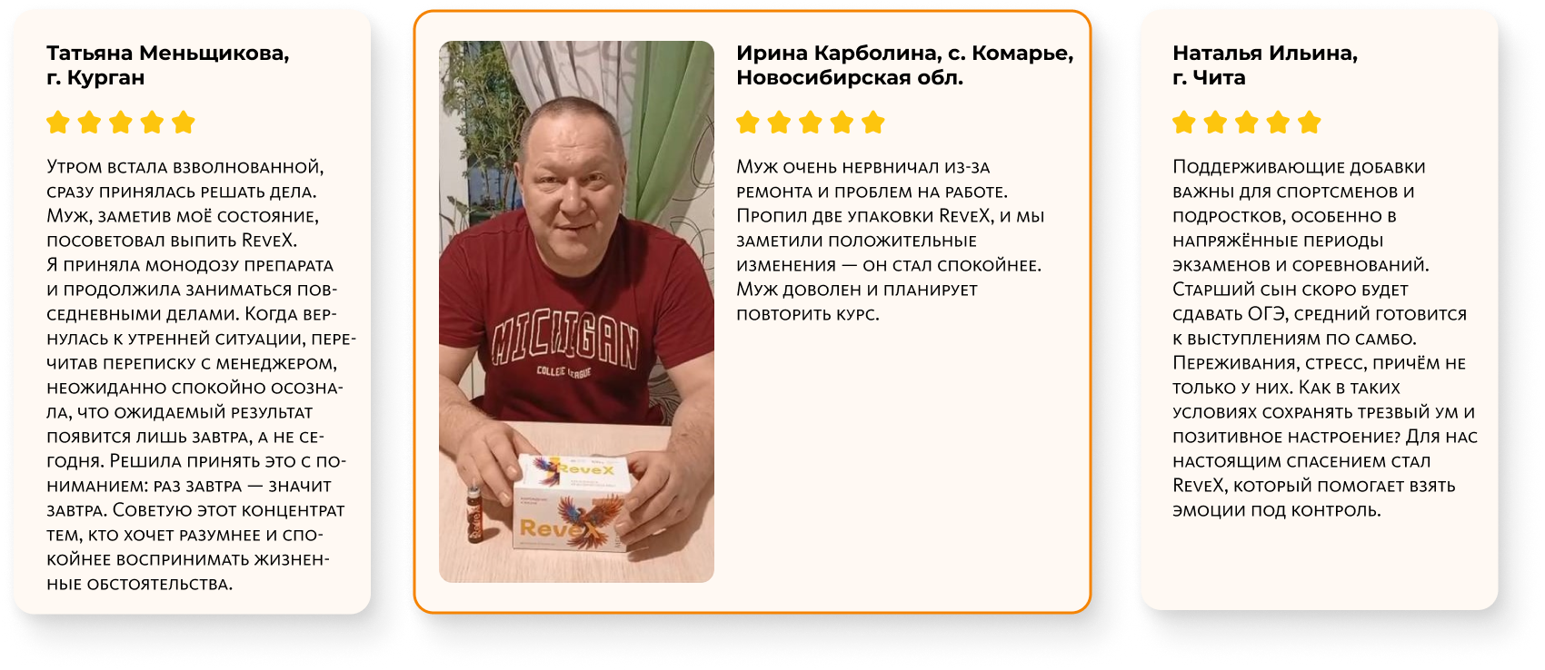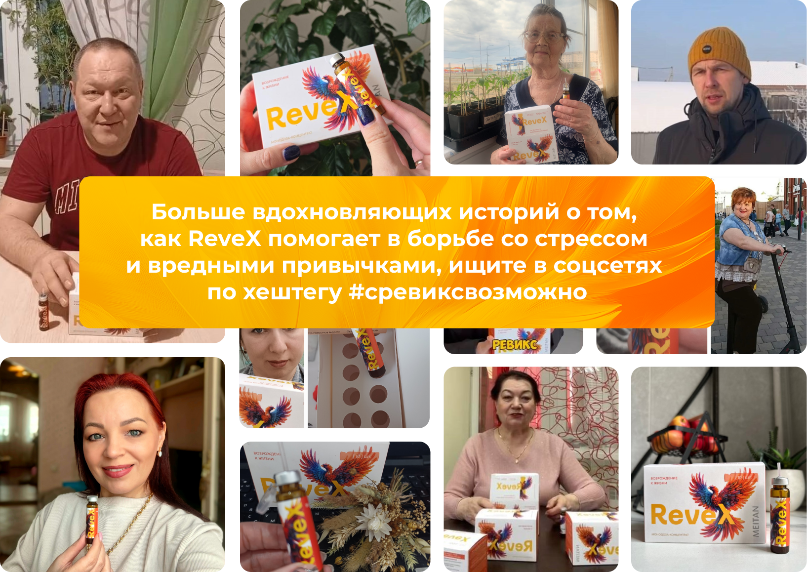 Легче справляться с повседневными тревогами и стойко переносить серьёзные стрессы? Отказаться от курения и перестать заедать проблемы сладким? С ReveX это возможно — доказывают жители разных регионов нашей страны, которые уже испытали действие комплекса на себе или увидели результат у близких и знакомых.