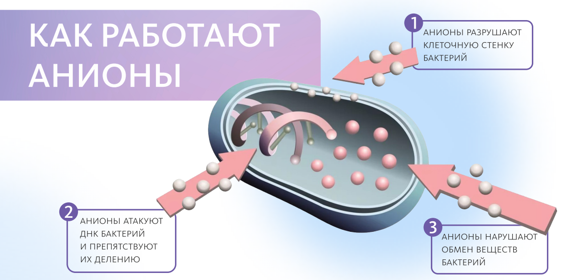 Анионы – молекулы кислорода с отрицательным зарядом. Человек не может физически чувствовать воздействие анионов, однако они оказывают положительный эффект на различные системы организма, в частности на кожу и слизистые. Все дело в том, что большинство патогенных анаэробных бактерий не может в жить в присутствии кислорода, а анионы – это и есть кислород. При контакте с анаэробными бактериями анионы оказывают следующее действие: