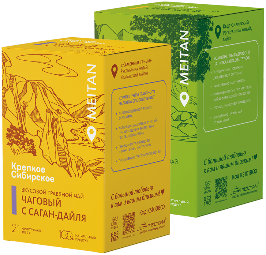 Травы для наших продуктов собирают вручную в экологически чистых лесах и лугах Алтая и Восточной Сибири. Рецептуры оздоровительных продуктов – результат совместного труда специалистов фармацевтический завода MEITANGreen, ученых сибирских НИИ и Алтайского государственного университета. Качество 100% управляемо и прогнозируемо.