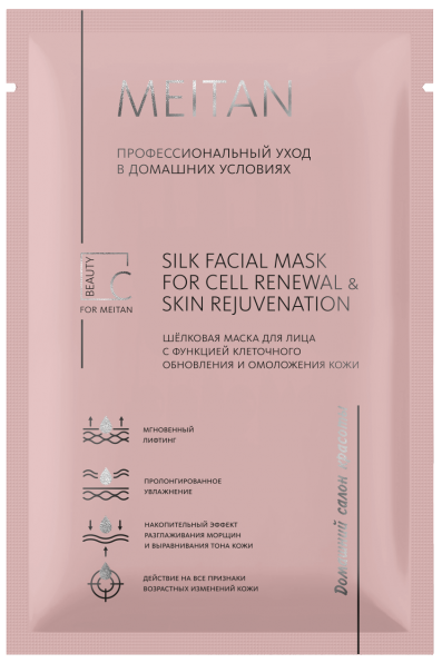 Расправьте маску и аккуратно отделите её от перфорированной подложки. Нанесите на очищенную кожу, через 15-20 минут снимите в направлении снизу вверх, ополосните лицо тёплой водой. Нанесите крем МейТан, подходящий вам по типу кожи.