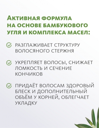 Бамбуковый уголь эффективно очищает кожу головы от загрязнений, токсинов, излишков кожного себума и остатков стайлинговых средств. Предотвращает быстрое загрязнение и появление перхоти. Масла оливы, кокоса, ши, авокадо и виноградных косточек питают и увлажняют, разглаживают структуру волосяного стержня, укрепляют волосы, снижают ломкость и сечение кончиков. Шампунь придаёт волосам здоровый блеск и дополнительный объём у корней, облегчает укладку.