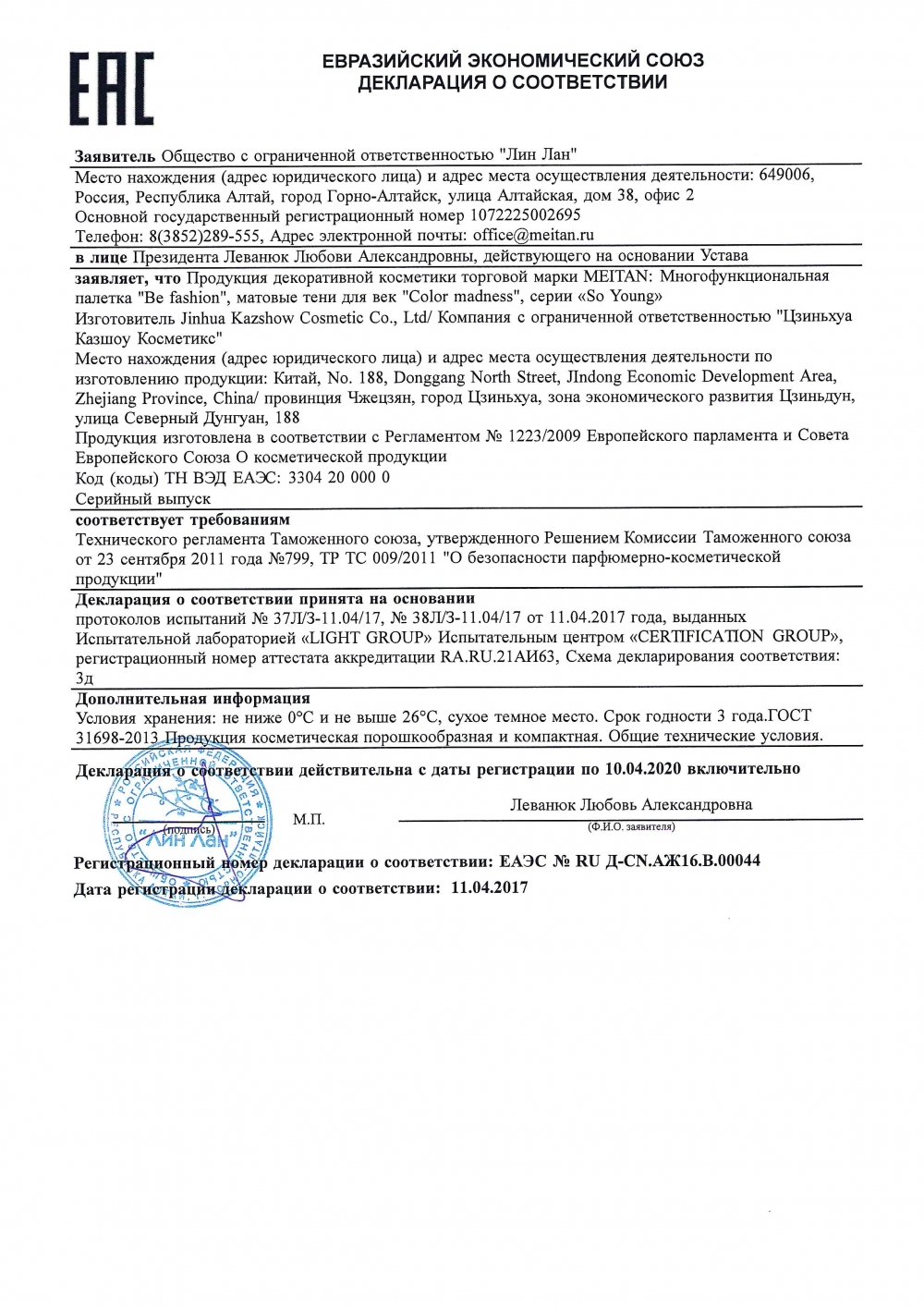 Тальк, полиэтилен, стеарат магния, минеральное масло, 2-феноксиэтанол, бутилгидрокситолуол, CI 77019, CI 77891, CI77861, CI 77491, CI77499, CI19140
