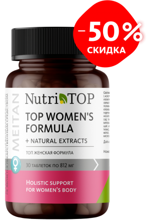 TOP Women's Formula (ТОП Женская формула) – высокоэффективный комплекс витаминов и минералов с экстрактами корня женьшеня, виноградных косточек, клюквы и листьев гинкго билоба. Рекомендуется в качестве биологически-активной добавки к пище – источника изофлавонов, арбутина, гинзенозидов, дополнительного источника витаминов группы В, А, С, Е, D, фолиевой кислоты, железа, цинка, марганца, меди и йода.