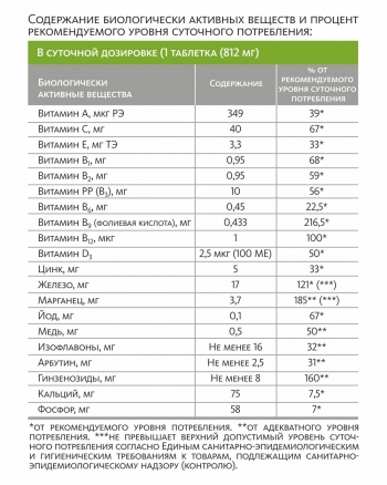 Карбонат кальция, двухосновной фосфат кальция, фумарат железа, L-аскорбиновая кислота, носитель микрокристаллическая целлюлоза, изофлавоны сои, экстракт корней женьшеня, стабилизаторы (крахмал, обработанный щелочью (натрия гликолят крахмала), кроскарамеллоза, поливинилпирролидон), экстракт виноградных косточек, экстракт клюквы, сульфат магния, сульфат цинка, таблеточное покрытие (носитель гидроксипропилметилцеллюлоза, стабилизатор полиэтиленгликоль; носитель этилцеллюлоза; антислеживающий агент тальк; краситель диоксид титана), сульфат марганца, никотинамид, экстракт листьев гинкго билоба, кукурузный крахмал, DL альфа-токоферола ацетат, антислеживающие агенты (магниевая соль стеариновой кислоты, диоксид кремния, тальк), ликопин, ретинол, тиамина мононитрат, сульфат меди, холекалиферол, рибофлавин, бета-каротин, пиридоксина гидрохлорид, фолиевая кислота, йодид калия, цианокобаламин.
