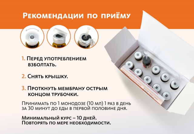 По 1 монодозе в первой половине дня до еды. Перед употреблением взболтать. Минимальный курс - от 10 дней. При высоком уровне стресса и в период отказа от вредных привычек рекомендуемый курс - 30 дней.
