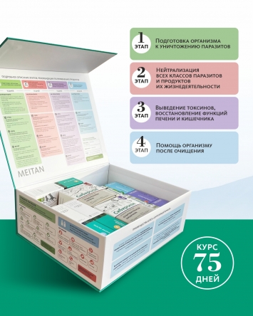 Программа антипаразитарного комплекса МейТан включает в себя 4 этапа, которые обеспечивают максимально полный цикл очищения и восстановления организма в домашних условиях от всех классов паразитов – гельминтов и простейших.