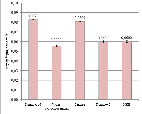 Адсорбционная активность «Клиносорба» по метиленовому синему (маркеру токсинов средней молекулярной массы) уступила активности Смекты, однако превысила активность угля активированного, Полисорба и МКЦ в 4,4; 8,1; 25,3 раз соответственно.