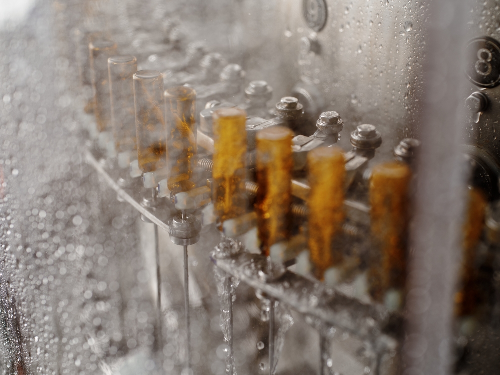 - На этапе визуального контроля каждая бутылочка тщательно осматривается на предмет любых дефектов: сколов, трещин, царапин, остатков загрязнений, водных пятен, посторонних включений или помутнений.