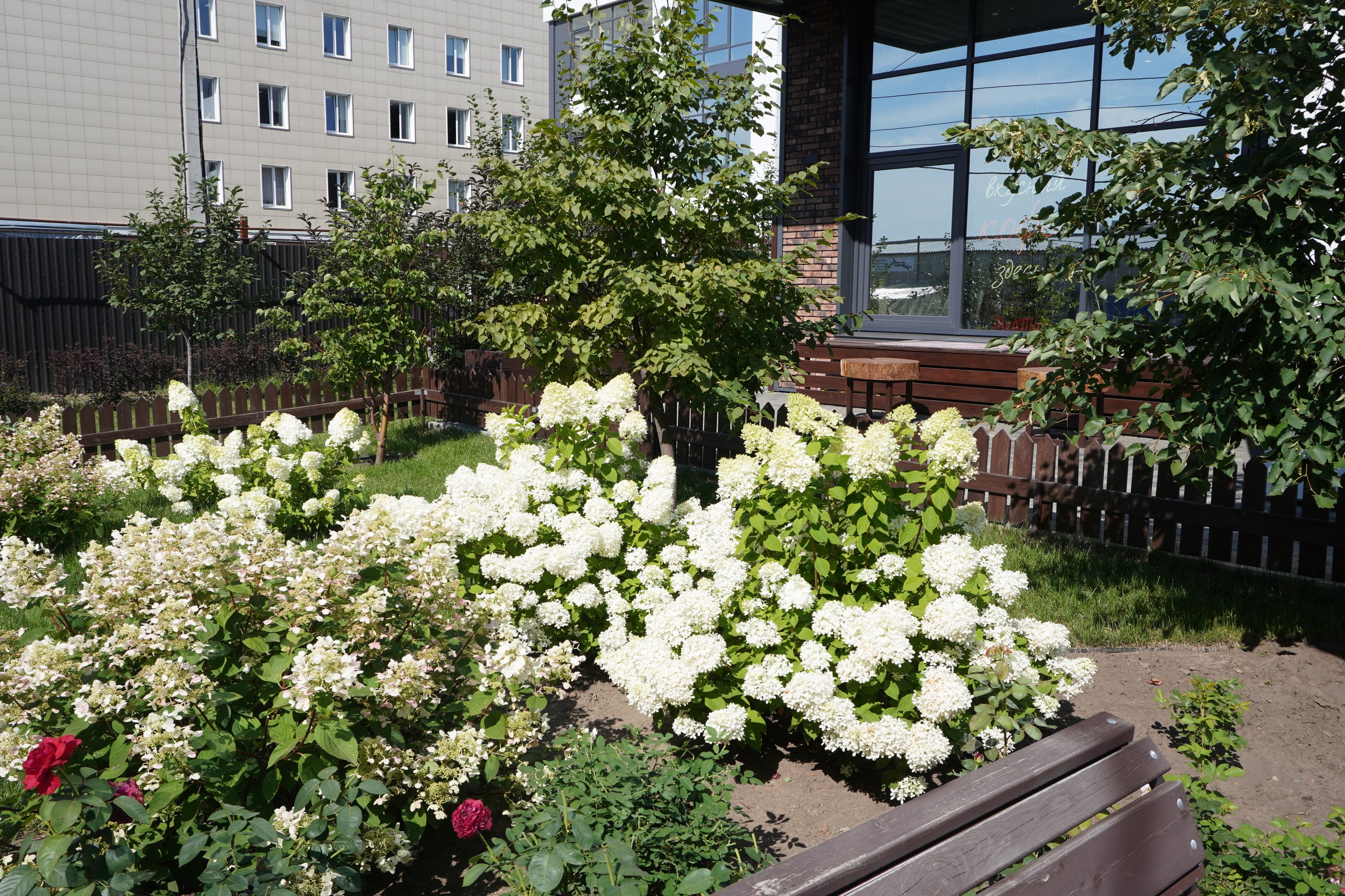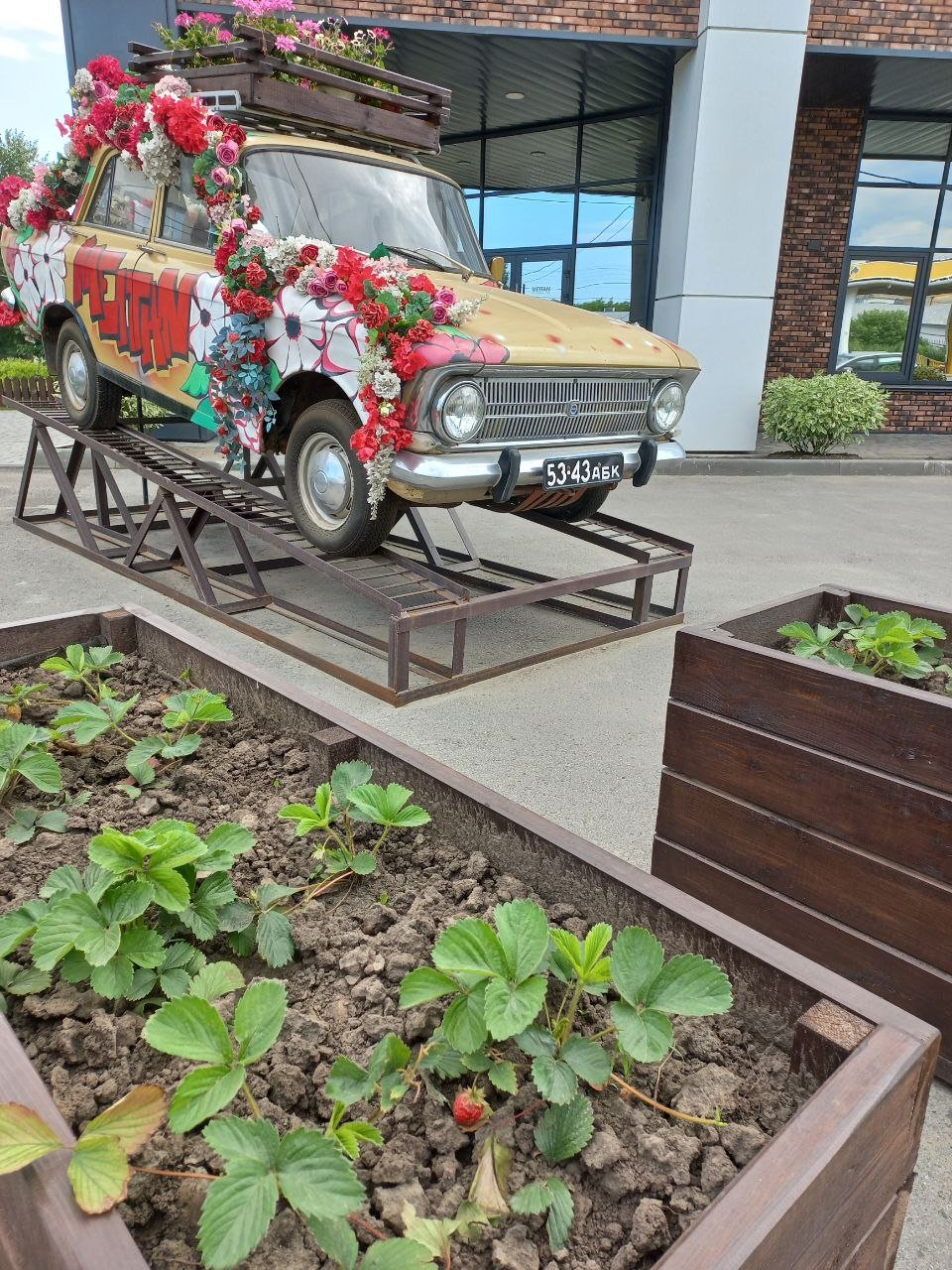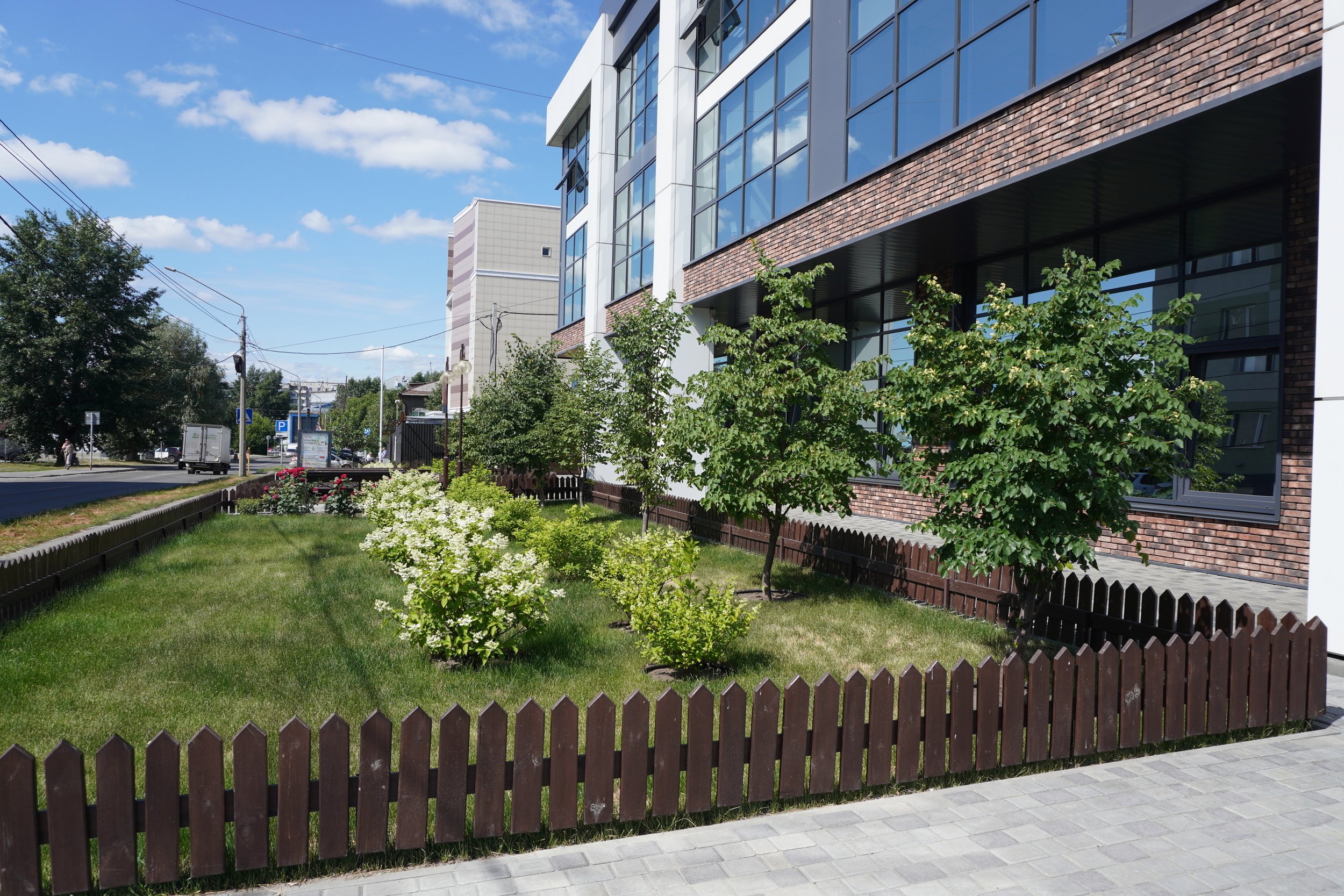 Сегодня территория офиса МейТан – это настоящий оазис красоты и уюта. Розарий, живописные гортензии, декоративные кустарники и ухоженный газон создают атмосферу спокойствия и гармонии. Центральный вход офиса украшают вазоны с пёстрыми петуниями, а брутальные короба с сортовой клубникой привносят нотку оригинальности. Яркий «Москвич» Петрович добавляет пространству жизнерадостности и креатива. На внутреннем дворе офиса – своё гармоничное пространство, там раскинулись яблони, созревает ароматная клубника и малина.