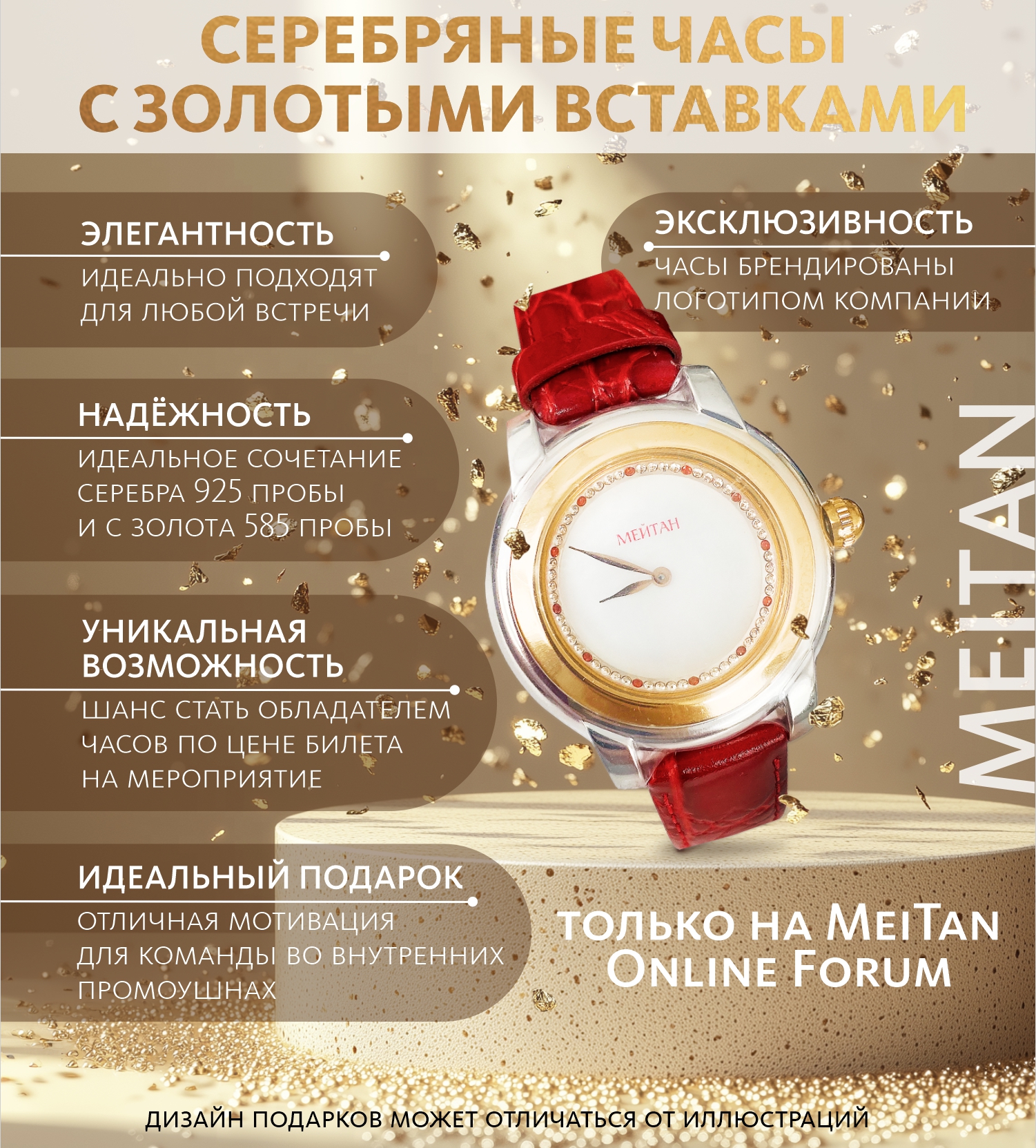 - Уникальная возможность. Участвуя в MeiTan Online Forum, Консультанты, зарегистрированные в Компании до 01 мая 2024 года, получают шанс стать обладателем этого потрясающего аксессуара всего-лишь по цене билета на мероприятие.