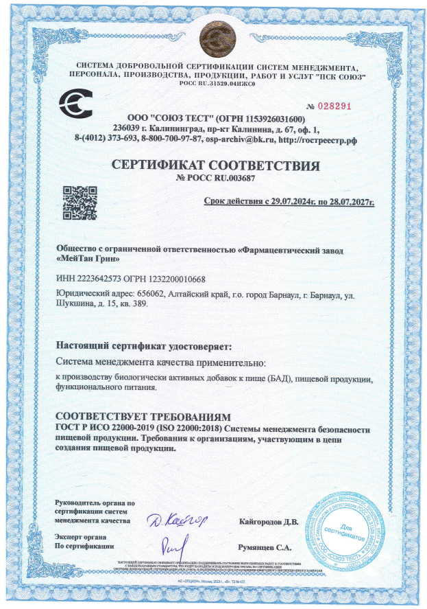 Сертификация ГОСТ Р ИСО 22000-2019 (ISO 22000:2018) подтверждает, что на заводе MEITAN Green внедрена система контроля, которая устраняет риск возникновения опасных для здоровья факторов на всех этапах производства, от получения сырья до упаковки готовой продукции.