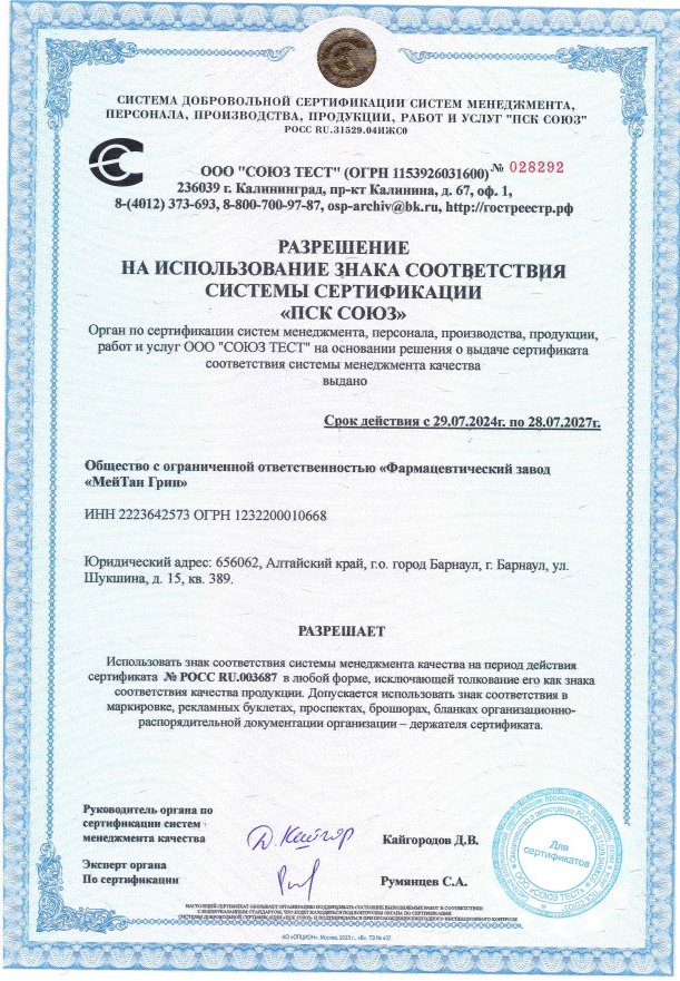 Фармацевтический завод MEITANGreen подтвердил соответствие требованиям системы менеджмента безопасности пищевой продукции. Компания получила сертификат ГОСТ Р ИСО 22000-2019 (ISO 22000:2018), это означает, что производство на всех этапах соответствует самым строгим международным стандартам, гарантируя потребителям безопасность выпускаемых продуктов.