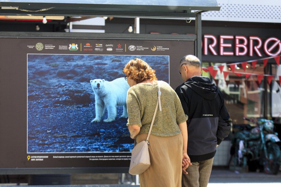 На стендах люди могут полюбоваться медведями, чайками, моржами, высокими скалами и бескрайним морем.