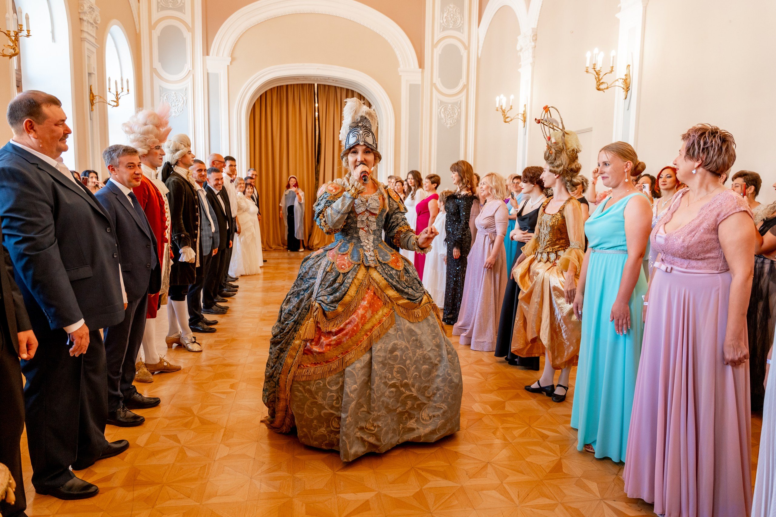 Когда большая часть гостей собралась в парадной – анфиладе, окна которой смотрят на праздничный и торжественный Невский проспект началось самое интересное. В зале появилась гофмейстерина (прим. историческое придворное звание высшего ранга. В ее обязанности входит организация церемоний и приемов, внимание придворным дамам. Она имеет высокое социальное положение и имеет право носить особые знаки отличия). Она дала старт балу МейТан и Консультанты Компании закружились в танцах: полонез, менуэт, вальс.