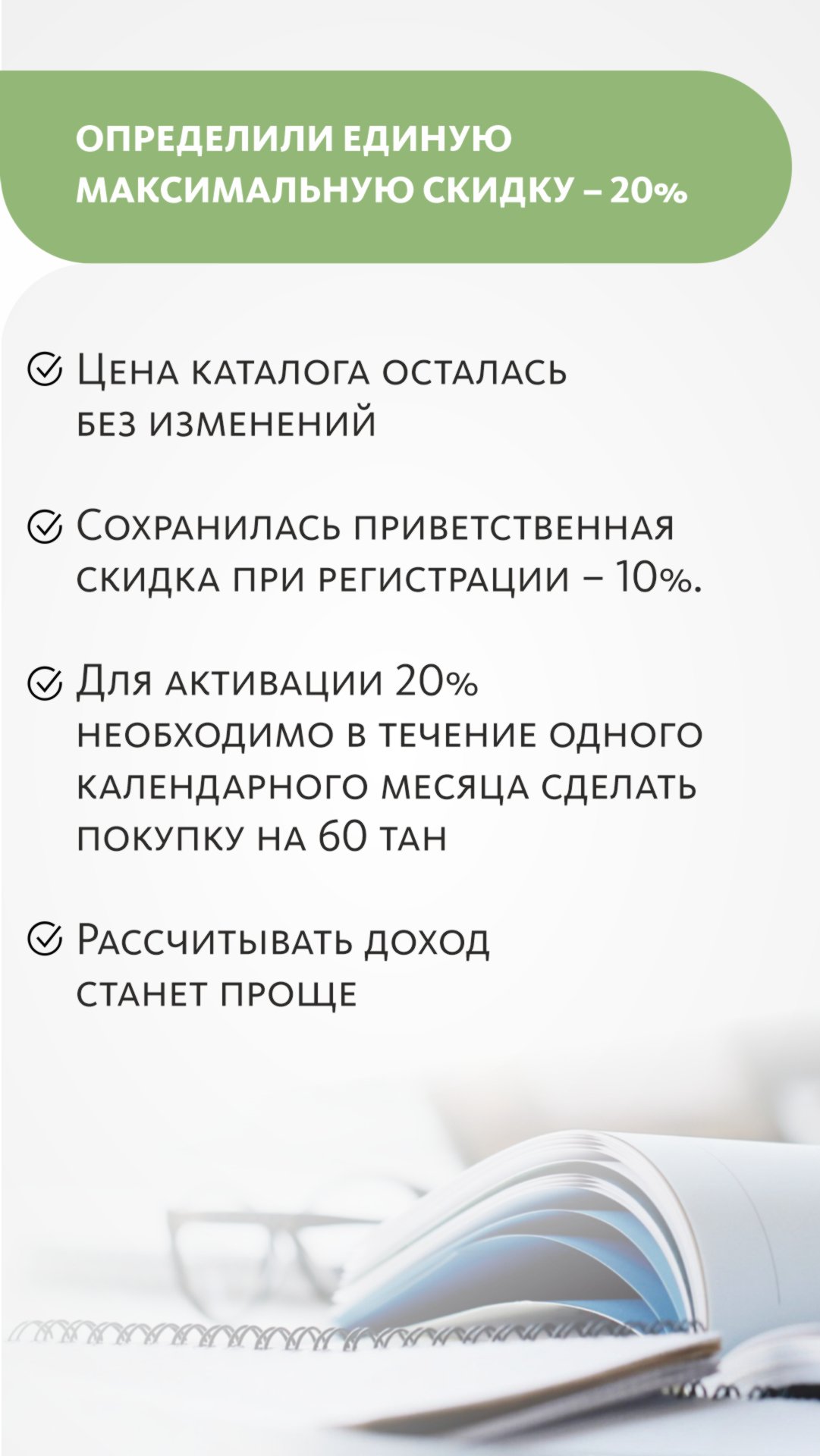 На старте, в качестве приветствия – 10%. А, если новый Консультант будет активно пользоваться продуктом Компании и купит в течение одного месяца на 60 тан, то получит скидку 20% от цены каталога на весь ассортимент.