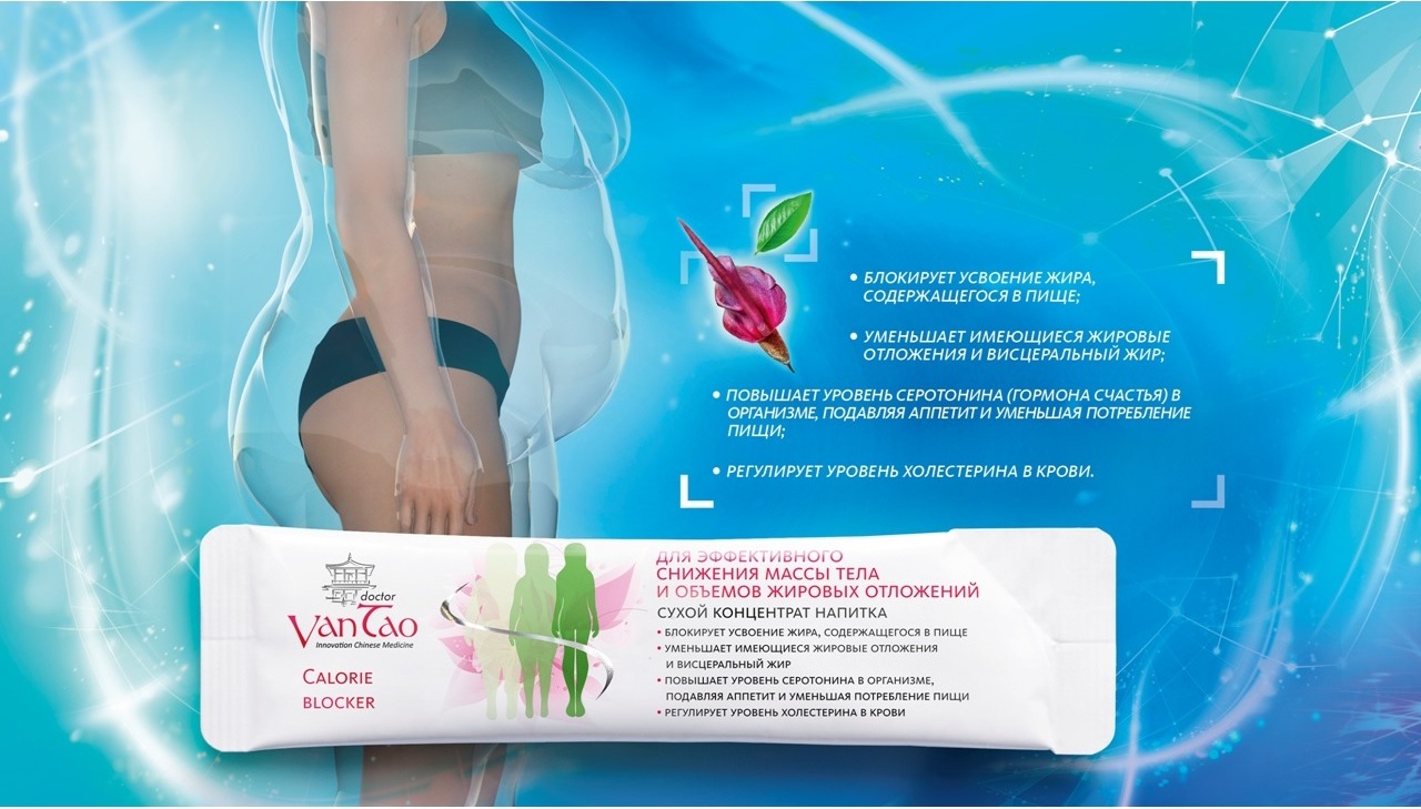 «Сalorie blocker» связывает поступающие с пищей жиры, снижая калорийность и вредность съеденной пищи. Способствует уменьшению имеющихся жировых запасов, в том числе помогая при самом опасном для здоровья висцеральном ожирении. Кроме того, он снижает тягу к мучному и сладкому за счет повышения уровня серотонина в крови. Напиток улучшает жировой обмен, способствуя снижению холестерина и профилактике атеросклероза.
