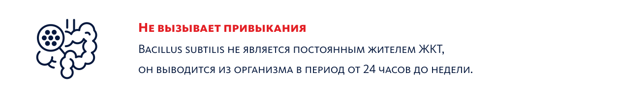 Bacillus subtilis, попадая в кишечник, нормализуют микробный баланс, подавляя патогенные микроорганизмы и восстанавливая качественный и количественный состав микрофлоры. Но через достаточно короткий промежуток времени они погибают, и состав микрофлоры снова меняется в худшую сторону, а патогенные микроорганизмы размножаются, разрушая микрофлору.