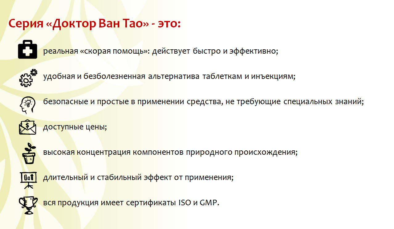 Флагманские продукты серии «Доктор Ван Тао» – био-стикеры и био-пластыри – безрецептурные средства, представляющие собой пластыри, на тканевую основу которых нанесена лечебная пластическая масса из более чем 35 экстрактов лекарственных трав и растений, ароматических масел и смол.